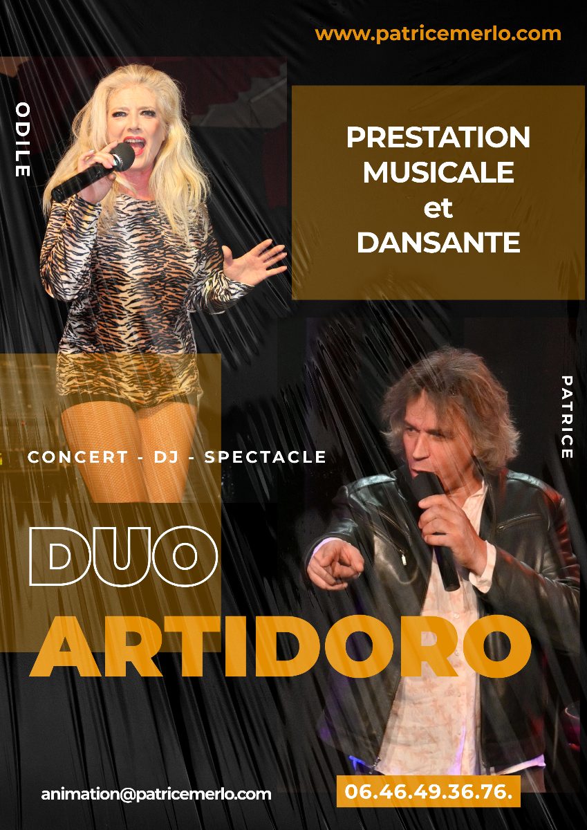 Le Duo ARTIDORO c’est avant tout l’alchimie parfaite entre deux voix complémentaires et une complicité évidente sur scène. Que ce soit pour un concert, une soirée dansante ou un spectacle, ce tandem unique promet une expérience musicale pleine de joie, de partage au rythme d’un répertoire reflétant les tendances actuelles tout en rendant hommages aux classiques intemporels. Plusieurs formules proposées s’adressant à tout public et pour tout évènement privé et public. –Concert dansant Duo ARTIDORO Du premier accord feutré d’un cocktail raffiné à l’énergie maîtrisée d’une piste en effervescence –DJ généraliste « au son de toutes les musiques » –Spectacle Music-Hall ARTIDORO Show –Cartoons en Scène Spectacle pour les petits et les grands –Animation micro (Salons, Evènements, Marchés) Tous les contenus sur www.patricemerlo.com Intervention en région Nouvelle Aquitaine résa & infos : 06.46.49.36.76. / animation@patricemerlo.com